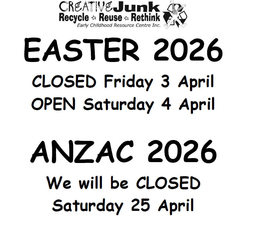 Closed Easter Friday 3 April & ANZAC 25 April Posted byCreative JunkMarch 13, 2026Posted inUncategorized Share this: Share on Facebook (Opens in new window) Facebook Like Loading... Related